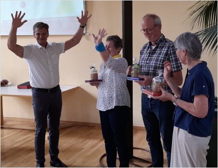 Im ökumenischen Gottesdienst verband Diakon Holger Meyer das Thema mit dem der Schöpfung und gebärdete Gedanken zur Erschaffung der Welt. Dann gab es Kaffee und Kuchen und später ein Bingospiel. Das Foto zeigt Pastor Gerriet Neumann mit den drei Gewinnern. Zum Abschluss wurde dann noch gegrillt.